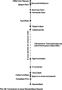 Расстояние между крепостью на холме Фрэнкенбери и Чарлтон-Клампсом равно 39,871 километра (24,75 мили) — довольно протяженный леи, но ничего похожего на предсказанный Мичеллом. Поскольку линия проходит через все упомянутые объекты, может быть показано точное построение, а беспокоиться о погрешностях не приходится. Его угол к сеточному северу составляет 350,7344°, или 350°44′4″ (рис. 98).