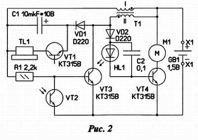 При очередном вспыхивании светодиода стрекотание прекращается, ток идёт по цепочке VD2, HL1, база-эмиттер VT4. Транзистор открывается и через двигатель Ml идёт ток. Виброход приходит в импульсное движение. Диоды VD1, VD2 выпрямительные, конденсатор С2 накопительный и нужен для обеспечения нормальной работы светодиода (без него светодиод не будет вспыхивать). Сердечник трансформатора Т1 взят из «схемы» энергосберегающей лампы. Его обмотки содержат по 30 витков провода ПЭЛ-0,3. Звукоизлучатель изъят из материнской платы старого компьютера.