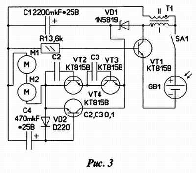Трансформатор Т1 и транзистор VT1 образуют блокинг-генератор. После замыкания ключа (выключатель SA1), в моменты времени когда транзистор закрыт, импульсы тока индуцированного суммарного напряжения обмоток трансформатора через развязывающий диод VD1 заряжают конденсатор С1. Резистор R1 ограничивает импульсы тока, управляющие работой транзистора. С течением времени напряжение на конденсаторе растёт. При его значении около 22 В происходит лавинообразное открывание транзисторов VT2, VT3. Через развязывающий диод VD2 заряжается конденсатор С4. Роторы последовательно включённых двигателей M1, М2 начинают вращаться. При снижении напряжения конденсатора С1 до 16 В транзисторы закрываются, однако открывается транзистор VT4. Происходит дальнейший разряд конденсатора С1 на обмотки двигателей. Для предохранения двигателей от перегорания (в зависимости от имеющихся экземпляров виброзвонков) последовательно в цепь с ними желательно включать ограничительный резистор номиналом 27–56 Ом. Далее цикл работы схемы повторяется. Конденсаторы С2, СЗ обеспечивают устойчивый «лавинный пробой» транзисторов.