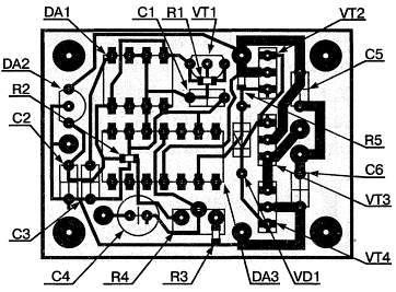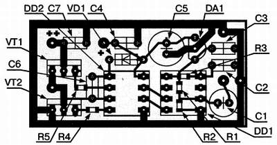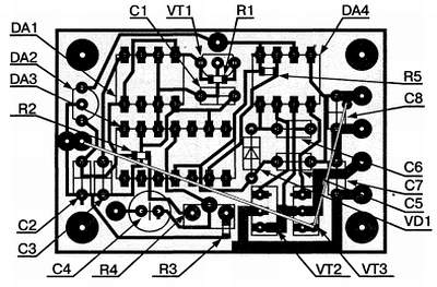Печатная плата. Усилитель собран на печатной плате из одностороннего стеклотекстолита толщиной 1,5 мм размерами 45x35 мм.