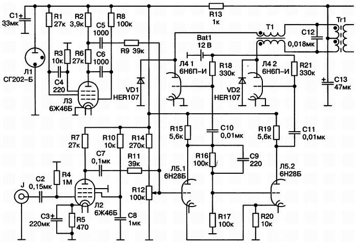 Рис. 4.15. Принципиальная схема усилителя на лампах