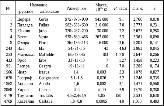 Параметры некоторых астероидов (Р — период суточного вращения, a и e — большая полуось и эксцентриситет орбиты)