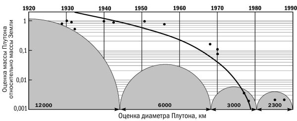Рис. 7.4. Оценки массы (черные точки) и размера Плутона первоначально были завышены, поскольку ошибочно предполагалось, что притяжение к Плутону возмущает движение Урана и Нептуна. После неоднократных переоценок в сторону уменьшения массы возникла даже шутка, что если экстраполировать кривую на будущее, то получится, что планета должна совсем исчезнуть в 1980 г.! В итоге анализ орбиты спутника Плутона, Харона, выявил истинную массу этой системы: около V400 массы Земли.
