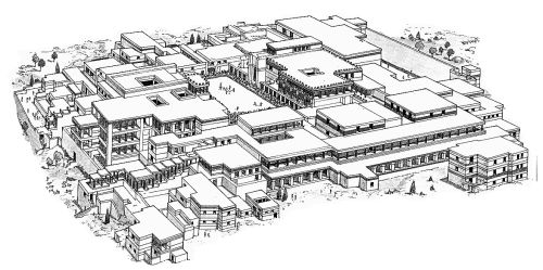 После долгих лет раскопок и кропотливой реконструкции археологи сумели восстановить образ стройного архитектурного ансамбля. Вокруг просторного, двора размером 50?50 метров, вымощенного камнем были выстроены самые разнообразные сооружения. Этажи дворца опирались на колонны и соединялись между собой монументальными лестницами. Сотни залов и комнат предназначались для торжественных приемов, служили покоями для царя и царицы, сановников и придворных дам, слуг и невольников. Здесь же располагались и просторные мастерские царских ремесленников.
