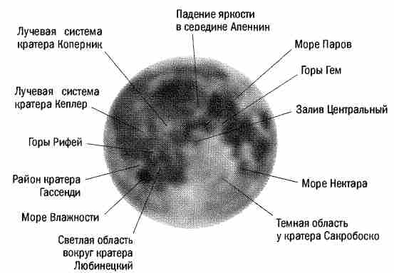 Вы тоже можете представить себя древним астрономом и попытаться разглядеть мелкие детали на Луне без телескопа. Разумеется, вы без труда отождествите большое темное пятно на ее левом полушарии — Океан Бурь. Приоткрытый «рот» лунного лика, примыкающий к Океану справа снизу — это Море Облаков, а «тень под губой» — Море Влажности. Правый (слева от нас) «глаз» — самое большое образование ударного происхождения на нашем спутнике — Море Дождей. Диаметр этого исполинского бассейна около 1000 км! Другой «глаз» Луны образуют Море Ясности и Море Спокойствия, сливающиеся на наш невооруженный взгляд в одно продолговатое пятно.