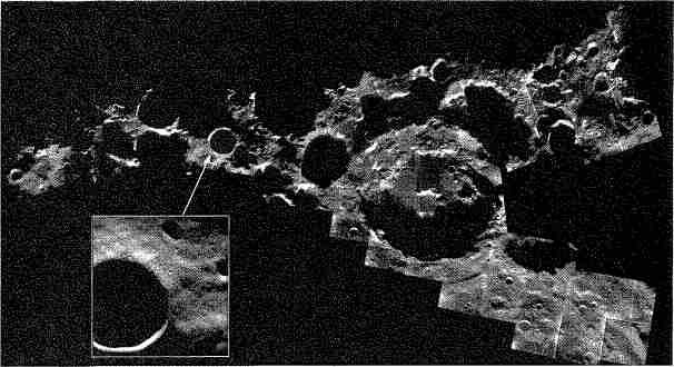 Рис. 1.31. Фотомозаика из снимков европейского зонда Смарт-1 области южного полюса Луны. На врезке и стрелкой показан кратер Шеклтон в разные моменты лунных суток. На дно этого кратера никогда не заглядывает Солнце, это «холодная ловушка», где долго может сохраняться водяной лед. Именно там собираются основать одну из научных баз будущие исследователи Луны.