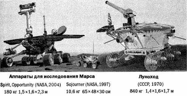 Рис. 1.34. Планетные самоходные аппараты в едином масштабе. Советский «Луноход» был первым, но до сих пор своими размерами и массой существенно превосходит все более поздние подвижные лаборатории. Оснащенный современной научной аппаратурой, он мог бы и в наши дни стать отличным исследователем Луны.