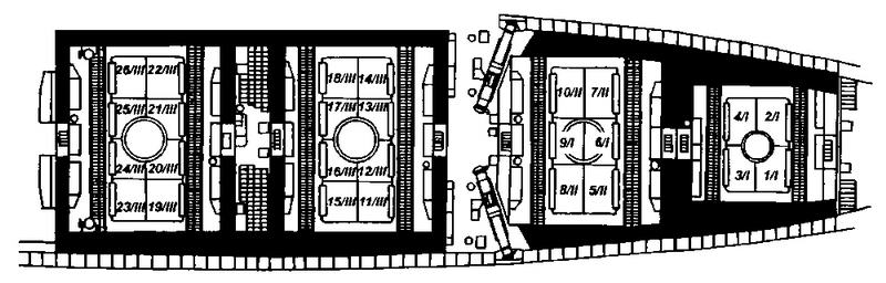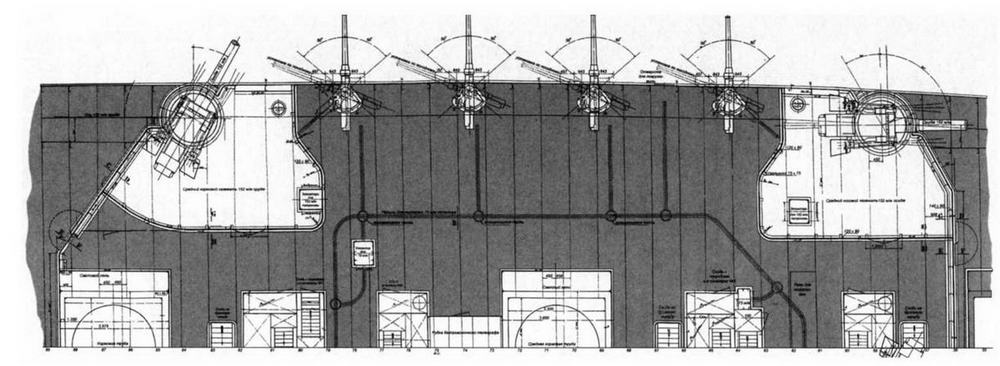 1. Расположение 6" и 75 мм артиллерии в центральном каземате крейсеров типа «Баян». Показаны пути подачи беседок 75 мм патронов от элеваторов к орудиям, а также схема загрузки торпед через бортовой лацпорт в отсек торпедных аппаратов.