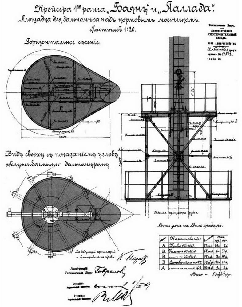 Учитывая неудобство действия базисным дальномером на «Адмирале Макарове» из тесной бронированной боевой рубки, помещённой из-за недостатка места в корме, при проектировании аналогичных постов на адмиралтейских «Палладе» и «Баяне» их кормовые дальномеры было решено поместить на открытых позициях. Уязвимость инструмента компенсировалась, как полагали, возможностью упреждающего взятия отсчёта дистанции до противника, после чего при переходе на поражение корректура прицела должна была вноситься по знакам падений снарядов. Судьба самого дальномера после этого становилась уже не так важна.