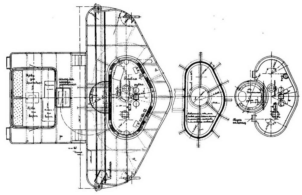 Что касается боевой рубки «Адмирала Макарова», она была более примитивна и являлась симбиозом довоенного и послевоенного подходов - эллиптическая в плане рубка первого «Баяна» оборудовалась вместо прежнего прикрытия в виде зонтика плоской броневой крышей, как и у обоих адмиралтейских крейсеров. Анахронизмом оставался вход в рубку - свободный проём в тыльной части шириной 0,9 м, условно прикрытый отдельно стоящей сзади выпуклой в плане вертикальной броневой плитой.