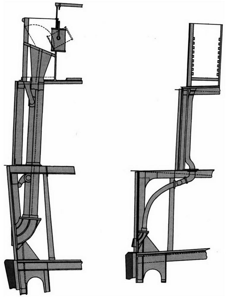 Поданная труба (1) - конической формы, к ней приклёпаны три площадки - две верхних для размещения прислуги у ручных приводов горизонтальной наводки, на третьей размещены электролебёдка и ручной привод подъёма зарядов, а также трансформатор горизонтальной наводки. Горизонтальных катков (2) 30, вертикальных (3) 78. Для замены и исправления горизонтальных катков башня поднимается на требуемую высоту посредством 4 30-тонных домкратов, помещающихся на круговом неподвижном фундаменте под нижним основанием подачной трубы башни.