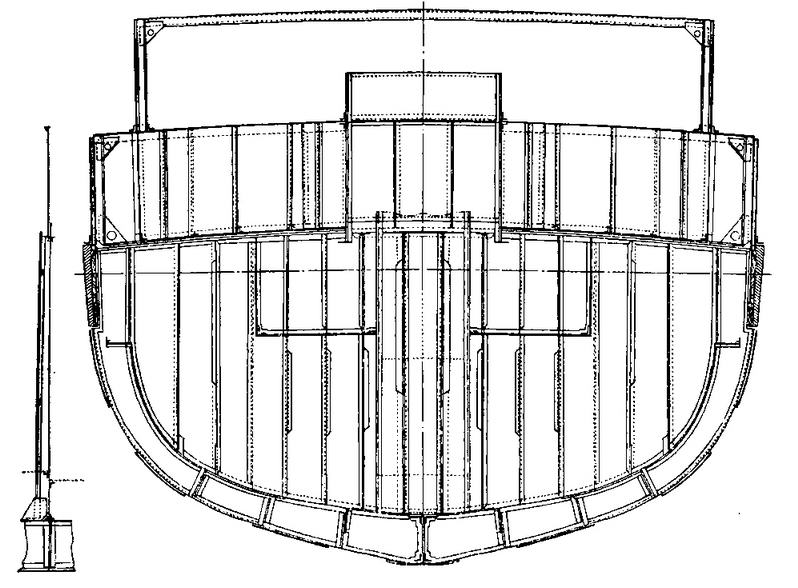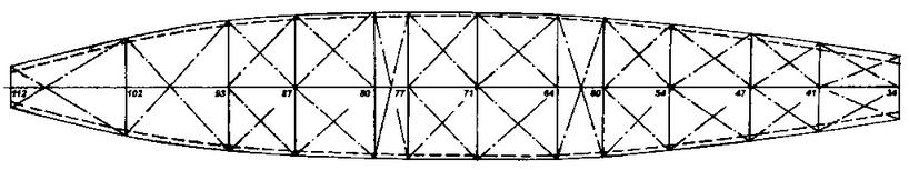 Корпус «Адмирала Макарова» и обоих воспроизведённых по его проекту в России собратьев повторял, с незначительными изменениями, прежний «Баян». Он имел три непрерывных палубы, изначально носивших названия верхней, батарейной и жилой (ко времени вступления всех трёх крейсеров в строй в русском флоте официально перешли на новую систему названий палуб, которые теперь стали именоваться соответственно верхняя, средняя и нижняя) - они проходили по всей длине корабля, от носа до кормы. Двойное дно простиралось от 34 до 112 шп и подразделялось глухими флорами на 12 отсеков (34-41, 41-47, 47-54, 54-60, 60-64, 64-71, 71-77, 77-80, 80-87, 87-93, 93-102, 102-112 шп)[1 Строившиеся в России по чертежам «Адмирала Макарова» крейсера «Паллада» и «Баян» получили русскую нумерацию шпангоутов - от носа к корме, такой же нумерации удостоился впоследствии и «Адмирал Макаров» на выполненной в МТК документации, в различных технических описаниях и отчётных чертежах. Этой же системы мы будем придерживать далее по тексту с особыми, в отношении построенного во Франции крейсера (там, где это необходимо), оговорками.]. Междудонное пространство под котельными отделениями (V, VI, VIII, X отсеки) подразделялось на две половины переборкой в диаметральной плоскости. Тринадцать главных поперечных водонепроницаемых переборок, простиравшихся от наружной обшивки до нижней палубы, делили внутренне пространство корпуса на 14 главных отсеков.