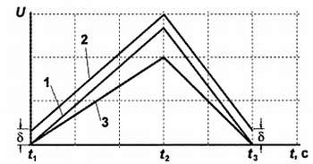 1 — идеальный случай, 2 — при сдвиге порога компаратора; 3 — при изменении емкости конденсатора