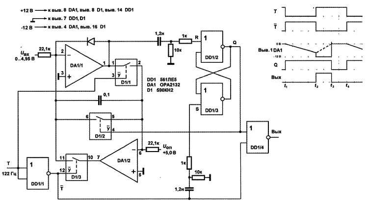 Это состояние длится до конца периода тактовой частоты, а с отрицательным перепадом на входе Т ключи D1/З и D1/2 закроются, и все начнется сначала. На выходе схемы образуется положительный импульс напряжения, длительность которого t3 — t2 пропорциональна входному напряжению, согласно соотношению, сформулированному ранее.