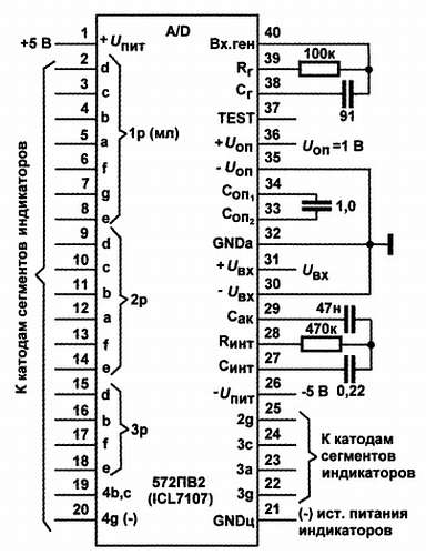 Рис. 17.8. Типовое включение микросхемы 572ПВ2 (ICL7107) в корпусе DIP-40