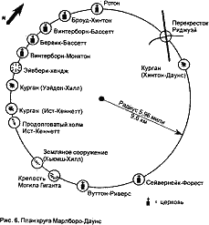 Далее случилось то, что повергло меня в изумление с первой же попытки я попал в яблочко (рис. 5). Окруж ность в 60 километров (37 миль) длиной прошла не только через все четыре церкви и Эйвбери хендж, но и еще через десять достойных внимания объектов Даже ось продолговатого кургана Ист-Кеннетт выстроилась вдоль края круга (рис. 6).