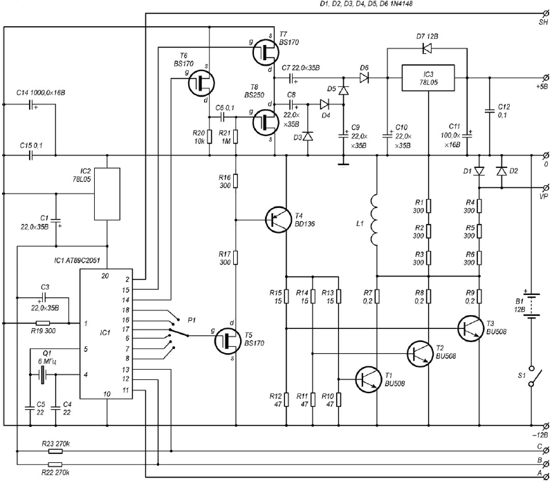 Первоначально на выводе IC1/14 микропроцессора формируется управляющий импульс для транзистора Т6, после окончания которого на выводе IC1/15 формируется аналогичный импульс для транзистора Т7. Затем этот процесс повторяется еще раз. В результате происходит запуск преобразователя напряжения.