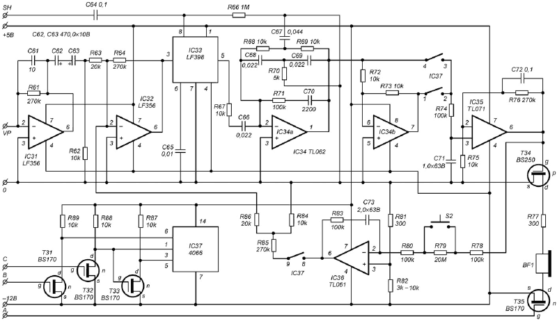 С выхода интегрирующей цепочки импульсный сигнал проходит на вход усилительного каскада, который выполнен на микросхеме IC35 и одновременно выполняет функции фильтра низких частот. Падение напряжения на выходе операционного усилителя (вывод IC35/6) приводит к открытию транзистора Т34 и подключению к общему проводу головных телефонов BF1. При поступлении с соответствующего выхода микроконтроллера (вывод IC1/11) на транзистор Т35 управляющего сигнала в телефонах будет прослушиваться сигнал звуковой частоты. Резистор R77 ограничивает ток, протекающий через головные телефоны BF1. Его подбором можно регулировать громкость акустического сигнала.