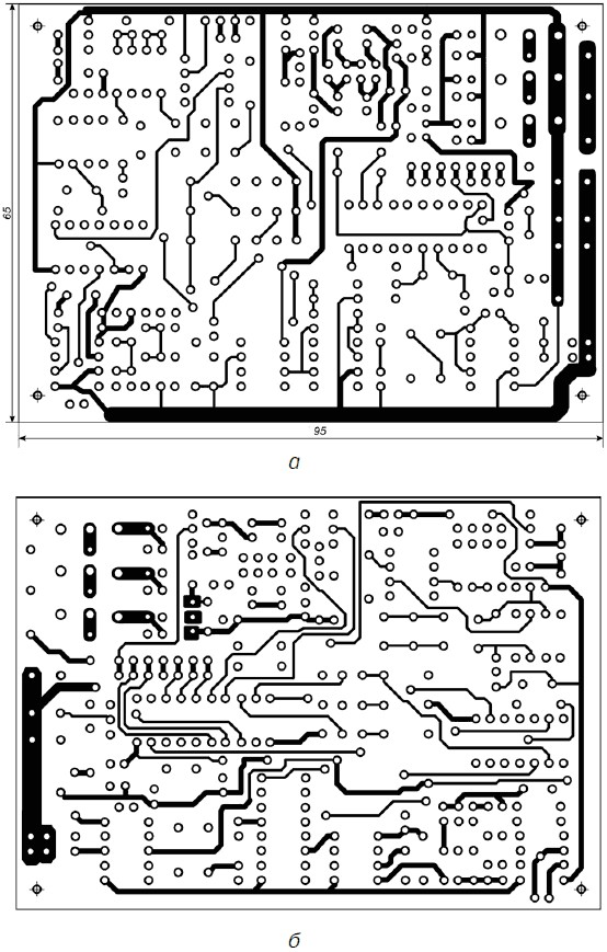 Все детали рассматриваемого прибора (за исключением поисковой катушки L1, переключателя Р1, выключателя S1 и кнопки S2) расположены на печатной плате (рис. 3.20) размерами 95х65 мм, изготовленной из двустороннего фольгированного гетинакса или текстолита.