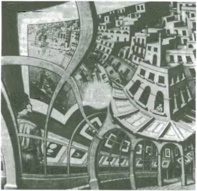 Таким образом, человеческое познание как эффективное действие принадлежит биологической области, но всегда проживается в той или иной культурной традиции. Объяснение когнитивных явлений, предложенное нами в этой книге, основано на традиции науки и остается в силе, покуда удовлетворяет научным критериям Особенность этого объяснения внутри самой научной традиции, однако, в том, что оно порождает фундаментальное концептуальное изменение: познание не касается объектов, ибо познание — это эффективное действие, и по мере узнавания того, как мы познаем, мы порождаем самих себя Познание нашего познания — это не линейное объяснение, начинающееся с некоторой абсолютной точки и развивающееся до полного завершения по мере того, как все становится объясненным. Познание того, как мы познаем, скорее напоминает мальчика из «Картинной галереи» Эшера (рис. 72). Картина, которую он разглядывает, постепенно и незаметно трансформируется… в город, в котором находятся и галерея и сам мальчик! Указать исходную точку невозможно, (де она: Снаружи? Внутри? Чего? Города? Разума мальчика? Но признание этой когнитивной циркулярности не создает проблемы для понимания феномена сознания. Напротив, оно становится исходным пунктом, позволяющим нам объяснить феномен познания научно.