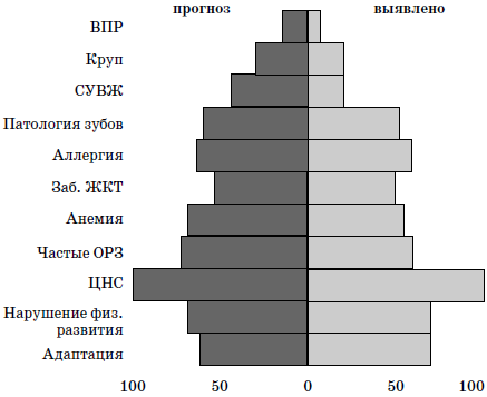 Прогностический блок данной программы используется на кафедре поликлинической педиатрии РМАПО. Ретроспективно был осуществлен прогноз риска развития отклонений в состоянии здоровья и развития у 70 детей, воспитывающихся в домах ребенка, и проведена оценка реализации этого риска. Результаты исследования представлены на схеме 5.