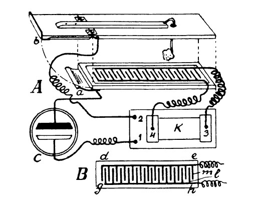 От обеих полосок идут провода: один через батарею с к клемме 1-й первичной спирали катушки к, другой прямо к клемме 2-й той же спирали.