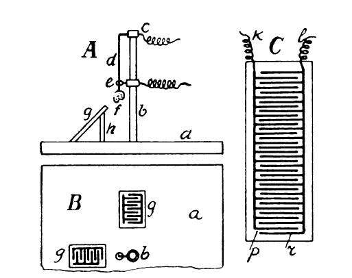 В этом случае в центре довольно толстой основной доски а (А и В, рис. 10) укрепляется вертикально палка b, высотой около 15 см (а в ловушке для крыс вдвое выше). На металлическом кольце с укрепляется стальная упругая проволока d, свешивающаяся вертикально и проходящая сквозь второе металлическое кольцо е. Оба кольца соединены с клеммами первичной обмотки спирали Румкорфа, одно прямо, другое как в предыдущем приспособлении, через батарею (батарея и спираль Румкорфа на рисунке не показаны).
