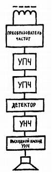 Л. — Это вполне может быть супергетеродин, состоящий из преобразователя частоты, двух каскадов УПЧ, детектирующего диода и двух каскадов УНЧ, причем выходной каскад может быть собран по двухтактной схеме.