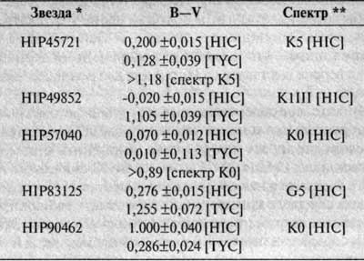 Сравнивая показатели цвета, определенные по наземным наблюдениям и измеренные «Гиппархом», удалось выделить 5 звезд, которые формально покраснели, и одну «побелевшую». При этом их показатели цвета В — V в разных каталогах разнились не менее чем на 0,7. Аналогично нашлось еще 5 звезд, у которых показатели цвета оказались слишком низкими по сравнению с их температурами. Проверка в банке звездных данных SIMBAD и в первоисточниках позволила отсеять случаи возможной путаницы, когда под одинаковыми номерами могли наблюдаться разные звезды. В результате можно указать наиболее вероятные случаи изменения показателя цвета и температуры звезды (см. таблицу). У всех звезд, перечисленных в таблице, переменность не обнаружена. Они одиночны и не имеют поблизости звезд, с которыми их можно было бы спутать. Но налицо вопиющие противоречия оценок цвета по данным разных каталогов.