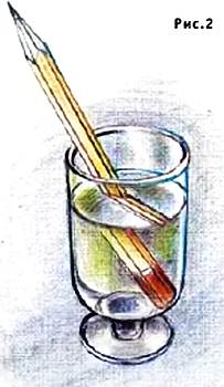 На дно стакана ставят карандаш и, глядя вдоль него, наливают в стакан воду (рис. 2).