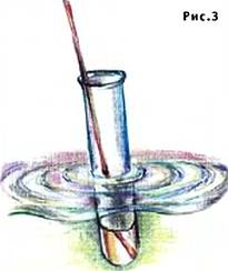 Удивительное дело — прозрачный воздух в прозрачной воде порою не позволяет нам видеть находящиеся в ней предметы. Он отклоняет идущий от них свет, и они делаются невидимыми. Налейте в пробирку немного воды, и часть пробирки с водой станет прозрачной. А оставшаяся часть по-прежнему будет блестеть, как серебро. Поместите в пробирку соломинку. Вы увидите ее нижний конец в той части пробирки, где есть вода. Там же, где находится воздух, карандаш не виден (рис. 3).