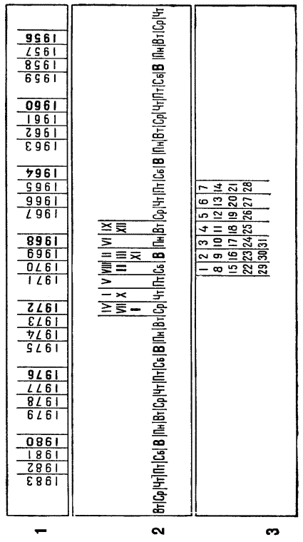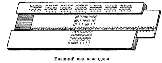 Календарь для 1944 года такой же, как и для 1972 (1944 + 28). Это год високосный. Поэтому, передвигая рейку, вы должны поставить в одну линию с 1972 годом январь — I-жирный и получите табель-календарь на этот месяц 1944 года. Вы родились 17 января, то есть в понедельник.