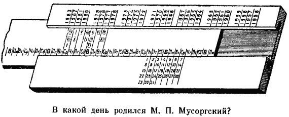 Для этого прежде всего нужно найти «подходящий» год в нашем календаре, умножая последовательно 28 на 2, 3, 4, 5. Очевидно, таким годом будет 1979-й (1839 + 140). Теперь передвиньте рейку так, чтобы март (III) стал в одну линию с 1979 годом. Получите табель-календарь на этот месяц, и 21 марта придется на среду. Добавьте еще один день, и вы узнаете день рождения Мусоргского: четверг.