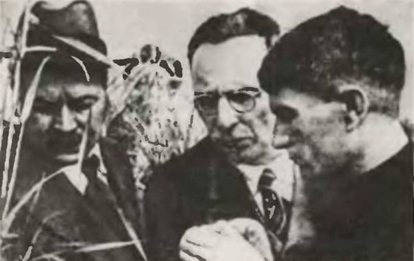 В поле (слева направо): Н. И. Вавилов, Г. К. Мейстер и Т. Д. Лысенко