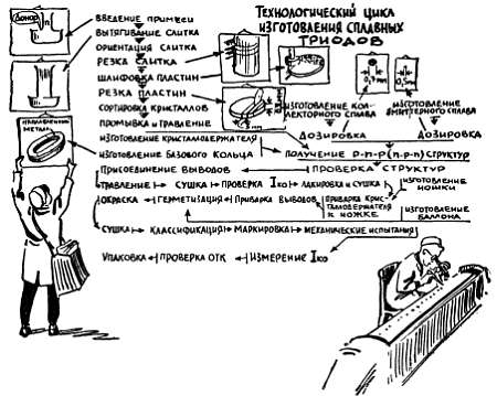 Рис. 90. Производство транзистора — это большой комплекс сложных технологических операций.