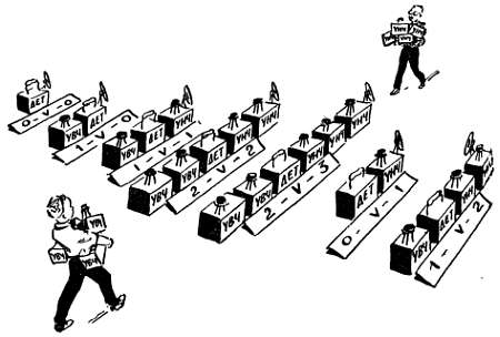 В электрических импульсах, включающих тот или иной элемент схемы, записана и программа действия машин. Например, вводятся в машину два числа А и Б и дается такая программа: «Умножить число А на число Б, затем прибавить число А к числу Б, разделить первый результат на второй…».