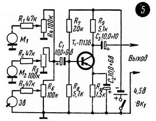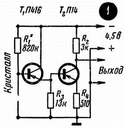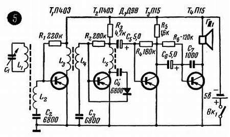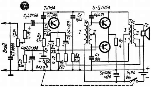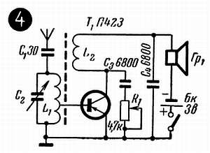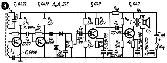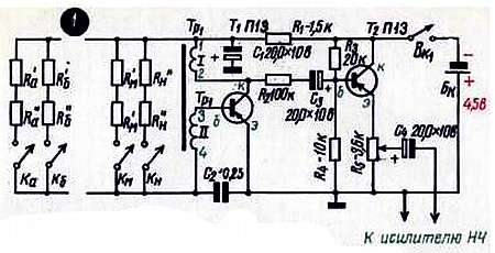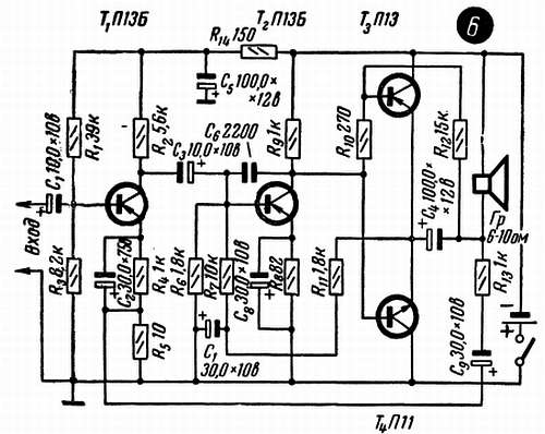 К основным группам схем, интересующих начинающего любителя, можно отнести собранные на двух-трех транзисторах приемники с головными телефонами (наушниками), схемы сравнительно простых, но уже на четырех — шести транзисторах приемников прямого усиления для громкоговорящего приема и схемы всеволновых супергетеродинных приемников. Усилители НЧ чаще всего разделяются на такие группы: усилители с выходной мощностью около 0,1 вт (100 мвт) и с маломощными (типа П41) транзисторами в выходном каскаде и усилители с мощными транзисторами (типа П214) и выходной мощностью 1–2 вт. И в той и в другой группе встречаются схемы, где громкоговоритель подключается к выходному каскаду через трансформатор или без него. Начинающие любители проявляют также интерес к простейшим схемам электромузыкальных инструментов и к приборам автоматики.