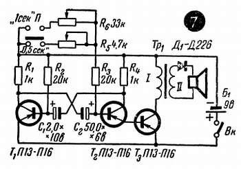 С коллекторной нагрузки каждого из транзисторов триггера постоянное напряжение подается на базу транзисторного реле (T9T10), в котором работает мощный триод, например, П201. На эмиттер этого мощного триода всегда подается отрицательное (относительно общего провода) напряжение с делителя R1R2. Это напряжение приложено «плюсом» к базе и поэтому запирает мощный транзистор. Необходимо сравнительно большое отрицательное напряжение, чтобы его отпереть, и именно такое отпирающее напряжение поступает с триггера. Когда какой-нибудь транзистор триггера закрыт, то на его коллекторе оказывается сравнительно большой «минус» — почти полное питающее напряжение, которое и отпирает мощный триод. Поскольку «минусы» на коллекторах появляются поочередно и держатся довольно долго — около одной секунды, — то и мощный транзистор оказывается открытым целую секунду в ожидании следующей «переброски» триггера.