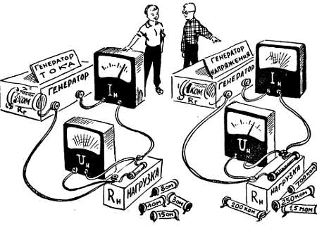 Рис. 125. Понятие «генератор тока» или «генератор напряжения» прежде всего отражает соотношение между сопротивлением генератора и нагрузки.