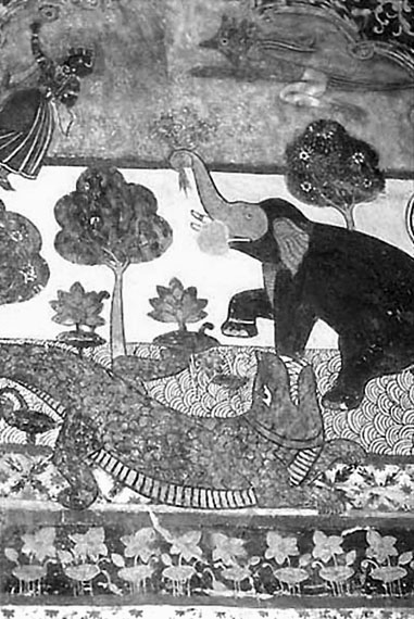 Кришна спасает слона из пасти крокодила. Фреска из Форта Орча