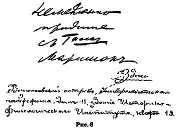 Между характером письма душевнобольных и их речью существует ярко выраженное сходство: размашистому, крупному письму соответствует рев и крик душевнобольного; мелкому и скудному (сжатому) письму — шепот или простое движение губ (рис. 6).