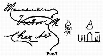 Частичное поражение того или иного участка мозга выражается графологически в непомерном увеличении какой-либо буквы или подобном извращении ее рисунка (рис. 7, скрытый период помешательства).