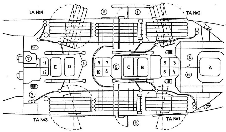 А... Е - дымоходы от котлов 1-4, 5 и 6, 7 и 8, 9 и 10, 11 и 12 соответственно; воздухозаборники вентиляторов форсированной тяги обозначены 3...12 для соответствующих котлов; 1 - торпеда, подвешенная на кране; 2 - порт для погрузки торпед; 3 - система подвесных рельсов для перемещения торпед по кораблю; 4 - запасные торпеды (одна над другой); 5 - система быстрой перезарядки торпед; 6 - мастерская; 7 - склад авиационных принадлежностей