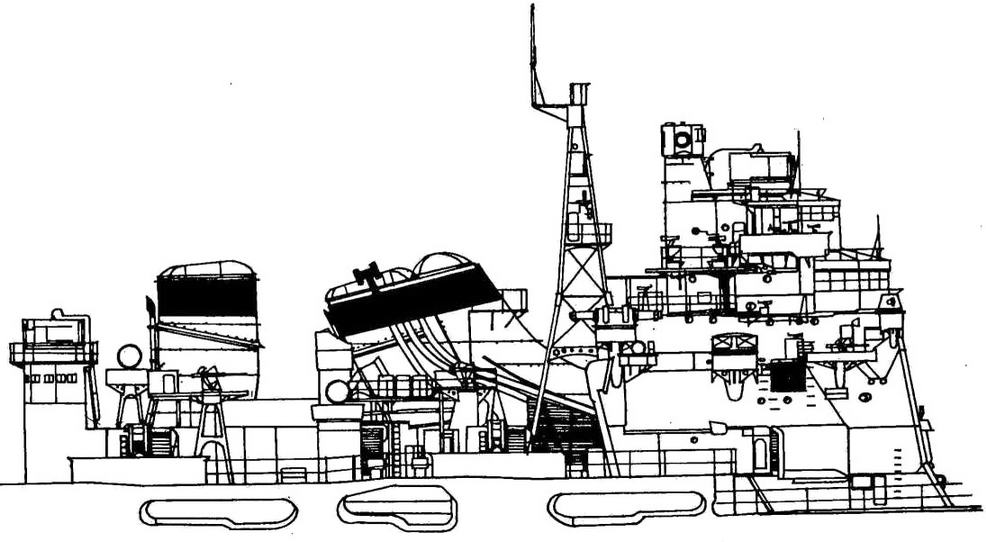1) Для уменьшения “верхнего веса” верхнюю часть носовой надстройки переделали, 4-опорную фок-мачту заменили треногой с гониометром и его постом, расположенными как на типе “Миоко”.