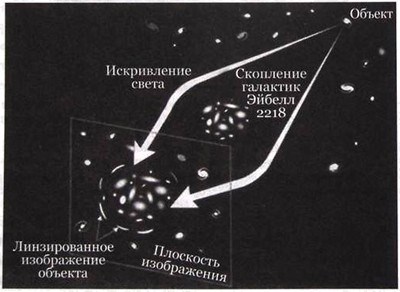 Рис. 25.4. Схемаt показывающая, как гравитационное поле скопления Эйбелл 2218 формирует дугообразные изображения далеких галактик фона. С разрешения NASA, ESA, Andrew Fruchter (STScI) и группы ERO (STScI + ST-ECF).