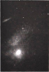 Рис. 25.2. Сочетание рентгеновского и оптического изображений крупной галактики М86 в скоплении Дева (Virgo). Рентгеновское излучение имеет наибольшую яркость в центре галактики и ослабевает к ее краям. Обратите внимание на рентгеновский хвост, возникший из-за движения галактики сквозь скопление и потери горячего газа из зоны гравитационного влияния галактики. С разрешения NASA/CXC/SAO/X-ray: С. Jones, W. Forman и S. Murray;Optical: Pal Obs. DSS.