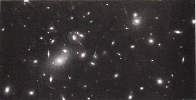 Как видимая, так и темная материя в скоплении галактик своим притяжением искривляют лучи света, идущие от более далеких галактик, создавая этим эффект гравитационной линзы. Измерив искривление, можно вычислить массу такой «линзы». Этот метод как бы делает темную материю «видимой». Приятно осознавать, что определенная этим способом масса темной материи совпадает с определенной по рентгеновскому излучению. Сейчас измерения полной массы темной материи в галактиках и скоплениях галактик считаются вполне надежными (рис. 25.3 и 25.4).