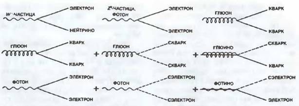 Верхний ряд иллюстрирует процессы, описываемые Стандартной Моделью. Взаимодействие в рамках суперсимметричной теории легко получить, заменив любые две линии, входящие в вершину Стандартной Модели, на линии соответствующих суперчастиц