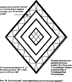 Для получения точного результата отражающая поверхность должна быть совершенно плоской. Если зеркальная поверхность оказывалась слегка вогнутой или выпуклой, лучи света рассеивались. Но из чего следовало изготавливать отражающую поверхность? Скорее всего из золота, и в Англии были найдены золотые изделия, датируемые примерно 2800 годом до н. э., хотя и считается, что до той поры оно не было доступным. В XIX веке ромбовидная золотая пластина была найдена в могильном холме бронзового века близ Уилсфорда, по соседству со Стоунхенджем. Эта пластина 17,8 сантиметра (7 дюймов) длиной и 15,2 сантиметра (6 дюймов) шириной, похоже, основана на углах в 40° и 50°, или на отношении 6:5. По ее краям нанесен резной шевронный рисунок, на считывающий девять сегментов на каждой стороне — всего 36. В центре пластины ромбоидальный рисунок 3×4 (рис. 79). Его зеркальная поверхность вполне могла отражать солнечный свет на значительное расстояние.