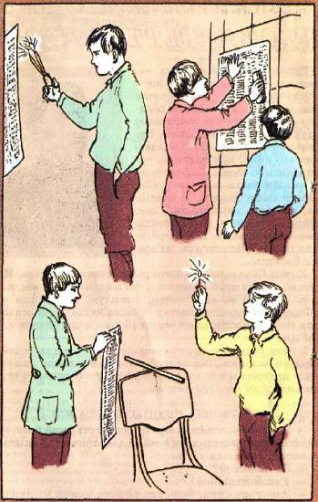 На другой день брат вновь начал опыты. Первым делом он «прилепил» к печке газету. Затем попросил у меня бумагу поплотнее газетной — писчую — и стал вырезать из нее смешные фигурки: человечков в разных позах.